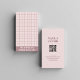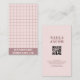 Visitenkarten-Design mit einem gedämpften, lila Prüfmuster in einem minimalen Layout, mit einem QR-Code für einfachen Zugriff auf eine Website oder ein Portfolio. Geeignet für handgefertigte Bekleidungsmarken, kleine Unternehmen oder Kreative.