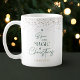 Modernes Weihnachtskaffeemodell mit einem Weihnachtsbaumdesign, das "Glaube an die Magie der Weihnachtszeit" in Kieferngrün mit goldenem Glitzer-Effekt rund um den Rand und weißem Hintergrund lautet. Personalisieren Sie mit Ihrem Namen oder Text und machen Sie das perfekte kleine Geschenke oder Geschenk für sich oder einen geliebten.
