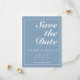 Hübsches, modernes, minimalistisches und trendiges Save the Date Design mit gletscherblauem Hintergrund und weißen, anpassbaren Textblöcken in modernen Schriftart