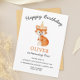 Eine niedliche whimsical Waldfox Neutrale Geschlechtsgeburtseinladung zum ersten Geburtstag mit dem Namen und dem Alter Ihres Kindes. Sie können den ganzen Text bearbeiten.