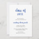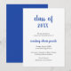 Minimalistische Abschluss-Ankündigungskarte mit einem einfachen und klassischen Design mit "Jahrgangsklasse" und dem Namen des Absolventen in einer dicken blauen Schrift-Handschrift auf weißem Hintergrund. Die Rückseite ist massiv blau. Eine traditionelle Ankündigungskarte mit einem modernen Flair für einen Absolventen.