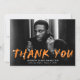 Stilvolle, moderne Abschluss Dankeschön-Karte mit dem waagerechten Foto des Absolventen mit "Danke" in orangefarbener Schrift mit weißen Spritzern. Personalisieren Sie die Vorderseite der kreativen Dankeschön-Karte, indem Sie den Namen des Absolventen, die Schule und Abschluss Jahr. Auf der Rückseite des Abschluss-Fotos danke Ihnen Karte Platz für eine getippte oder handgeschriebene Dankeschön-Nachricht und einen Spritzer-Hintergrund in Orange und Weiß.