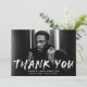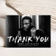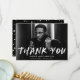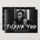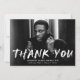 Stilvolle, moderne Abschluss Dankeschön-Karte mit dem waagerechten Foto des Absolventen mit "Danke" in weißer Schrift mit weißen Spritzern. Personalisieren Sie die Vorderseite der kreativen Dankeschön-Karte, indem Sie den Namen des Absolventen, die Schule und Abschluss Jahr. Auf der Rückseite des Abschluss-Fotos danke Ihnen Karte Platz für eine getippte oder handgeschriebene Dankeschön-Nachricht und einen Schwarz-Weiß-Spritzer-Hintergrund.