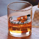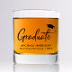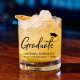 Ein lustiges Whiskey Glas zu Toast und feiern den Absolvent mit "Graduate" geschrieben in einer kühlen modernen Drehbuch mit einem Graduiertencap auf der Spitze und den Namen und Klasse Jahr des Absolventen in einfachen Typografie.