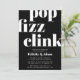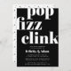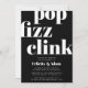 Moderne und minimalistische Einladungen mit einem dezenten Schwarz-Weiß-Stil mit "Pop fiz clink" in übergroßen, weißen Retro-Schriftzeichen. Personalisieren Sie sich mit Ihren Verlobung Feierlichkeiten Details unten. Einladungen kehren zu einem Muster von bunten Sternen in schwarz auf weiß zurück.