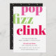 Moderne und minimalistische Silvesterabende-Party Einladungen mit eleganten, hellen Farbtönen und "Pop fiz clink" in mehrfarbigen Retro-Schriftzeichen. Personalisieren Sie mit Ihren Silvester Feierlichkeiten Details unten. Einladungen kehren zu einem Muster von bunten Sternen auf schwarz.