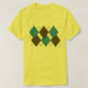 Dieses helle künstlerische T-Stück trägt ein versetztes grünes und braunes Rautenmuster zur Schau. Verfügbar im Gelb.
