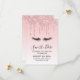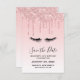 Eine moderne, trendige Glitterie Save the Date Einladung. Der Hintergrund hat ein Bild von glitzernden tropfenden Imitate-Glitzer an der Spitze. Die Erholung des Hintergrunds ist ein zarter pastellrosa Farbverlauf. Eine schwarze Wimpern-Abbildung komplettiert das Design.