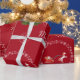 Elegantes und niedliches personalisiertes Weihnachtspapier mit dem Weihnachtsmann in seinem Schlitten, von einem Einhorn gezogen, verschiedene Schneeflocken, und Weihnachtsbäume mit silbernen Bauern dekoriert. Ideal für kleine Kinder, besonders für kleine Mädchen, die gerne Einhörner haben. Mit dem Gruß "Frohe Weihnachten / Emma!" in kursiven Drehbuch / Kalligrafie. Stellen Sie sicher, dass Sie den Namen personalisieren. Auf einem Weihnachtsrot.