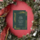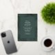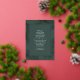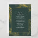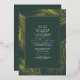 Modernes Design mit tropisch-reellen Goldfolienpalmen-Blätter, die auf einem dunkelgrünen Hintergrund mit eleganter Kalligraphie-Typografie umrahmt sind, verleiht dem Ganzen ein elegantes Aussehen.