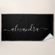 Modernes Strandhandtuch mit elegantem, weißem Schriftnamen auf schwarzem Hintergrund. Personalisieren Sie mit Ihrem Namen.