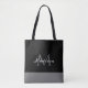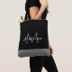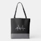 Moderne Schwarz-weiß-graue Script Monogram Name Tote Bag ist ein elegantes Design, das Sie jeden Tag mit Ihrem Modestatement tragen können. Der Hintergrund ist für jede gewünschte Farbe anpassbar. Das Zentrum hat ein Monogramm in Grau und Namen in weißen Kalligrafieschrift.