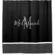 Moderner Schwarz-weißer und graugestrichener Monogram Name Duschvorhang ist ein stilvolles Design, um Ihrem Badezimmer einen neuen Look zu geben. Es ist mit Streifen in den Farben Schwarz, Weiß und Grau gestaltet. Ihr Monogramm-Initial entspricht dem Graubuchstaben und der Name ist in einem angesagten, weißen, handgeschriebenen Skript enthalten.