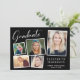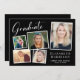 Moderne Schwarze Abschluss-Ankündigung mit einer 5-Foto-Collage verstreuter Bilder in weißen Rahmen, "Graduate" in einem stilvollen weißen Drehbuch, den Namen des Abas in eleganter Typografie und ihre Schule und Klasse Jahr in schlichter Typografie.