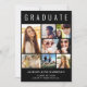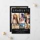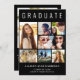 Moderne schwarze Abschluss-Ankündigung mit "GRADUATE" über die Spitze in großen weißen Typografie, eine 7-Foto-Collage und seinen Namen, Klassenjahr und Schule in der modernen weißen Typografie. Fügen Sie auf der Rückseite ein zusätzliches Foto und eine benutzerdefinierte Meldung hinzu.