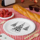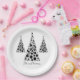 Stilvoll schwarzer Weihnachtsbaum auf einem weißen Dinner-Papierteller. Dieses moderne und elegante Design wird Ihrem Urlaubstisch ein wenig Pizzazz hinzufügen.