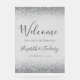 Die oberen und unteren Ränder dieses eleganten Schildes sind mit silbernen Imitaten Glitzer verziert. Passen Sie den Text in handgeschriebenen handgeschriebenen Schriftzeichen und Serifen auf einem hellgrauen Hintergrund an.
