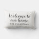 Das moderne weiße, schwarz-weiße "Welcome to Our Zuhause" Lumbalkissen verfügt über stilvolle Skripttexte mit benutzerdefiniertem Serif-Monogramm-Text, der mit dem Nachnamen Ihrer Familie personalisiert werden kann. Kissenstoffe im Innen- und Außenbereich stehen zur Verfügung.