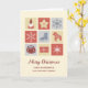 Frohe Weihnachten für den Sohn und seine Familienkarte mit niedlichen Illustrationen von Schneeflocken, einem Pullover und Geschenken.
