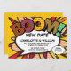 Personalisieren Sie mit Ihren Namen und Details, um die Änderung des Datums Ihrer besonderen Veranstaltung anzukündigen. Comic Buch Pop Kunst themed modern, Spaß Retro-Design, perfekt für Hochzeiten, Brautpartys, Babyduschen, Taufen, Verlobungen, Jubiläumsfeiern, Abschlüsse, Geburtstagsparty und andere besondere Veranstaltungen das ganze Jahr über! Ein cooles, trendiges und unterhaltsames Design, das den wackeligen Zap Pow in den Tag legt. Entwickelt von Thisisnotme©