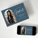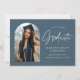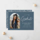 Trendy Abschluss Ankündigung mit dem Foto des Absolventen gerahmt von einem dunkelstählernen blauen Bogen mit "Graduate" in einem weißen handgeschriebenen Skript. Personalisieren Sie die Vorderseite der Erzankündigungskarte, indem Sie den Namen des Absolventen, das Abschluss Jahr, den Schulnamen und die Zukunftspläne hinzufügen. Die Ankündigung des Foto Abschlusses kehrt zurück, um ein gepunktetes Stahlmuster in Blau und Weiß anzuzeigen. Die Ankündigung eignet sich sowohl für Absolventen der Highschool als auch für Absolventen der Uni.