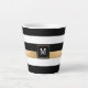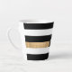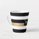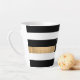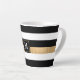 Moderne schicke latte Tasse in einem fett schwarzen, weißen und goldfarbenen Streifen Muster. Auf der Vorderseite der Tasse befindet sich ein Monogramm aus schwarzem und goldgelbem Quadratmeterblock mit weißem Single, das auf eine individuelle Gestaltung vorbereitet ist.