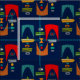 Mitte des Jahrhunderts Modernes Ti-Spielzeug mit abstrakten und geometrischen Formen auf einem marineblauen Hintergrund.