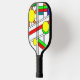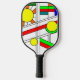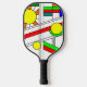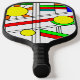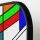 Dieses Pickleball-Paddel hat ein modernes Design von einem Buntglas-Look mit schwarzen Linien und Kreisen, gefüllt mit Primär- und Sekundärfarben.