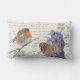 Moderner Vintager Vogel des Natur-Fotos Art. Robin, buddleja Blumen und Schmetterling auf Manuskript und weicher grüner Damasthintergrundbeschaffenheit. Kissen im Freien.