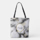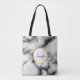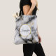Eine Tasche mit einem eleganten, modernen Marmormuster. Weißer, schwarzer und rauchiger grauer Marmor mit dünnen Bändern von Imitat-Gold-Wirbel im ganzen Muster. Ein weißer Kreis mit einem Imitat-Gold-Rahmen überlagert mit dem Monogramm-Initial und dem Namen im Inneren.