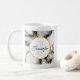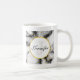 Eine Tasse mit einem eleganten, modernen Marmormuster. Weißer, schwarzer und rauchiger grauer Marmor mit dünnen Bändern von Imitat-Gold-Wirbel im ganzen Muster. Ein weißer Kreis mit einem Imitat-Gold-Rahmen überlagert mit dem Monogramm-Initial und dem Namen im Inneren.