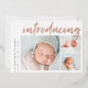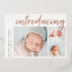 Eine elegante und moderne Geburtsankündigungskarte mit drei Fotos (ein Quadrat und zwei Horizonte), die oben in der Rose mit Buchstaben die Schrift "einführen". Personalisieren Sie Ihre Babynahrung und die Geburtsdaten auf der links Seite. Fügen Sie der Rückseite eine persönliche Nachricht und ein zusätzliches Foto hinzu.