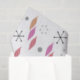 Ein Retro-Design aus der Atomzeit mit einem Weihnachtsthema. Verfügt über silberne Schneeflocken und rote, orangefarbene und lila Weihnachtsbaumschmuck.