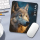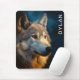Cooles Mauspad mit einem nahen Wolf bei Sonnenaufgang, Nachthimmel im Hintergrund. Dies kann mit einem Namen/benutzerdefiniertem Text auf der rechten Seite angepasst werden.