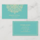 Eine Visitenkarte mit einer wunderschönen gelben Goldmandala auf einem aquamarinen grünen Hintergrund mit vollständig anpassbarem Text. Ideal für Yogalehrer oder andere ganzheitliche Heiler.