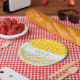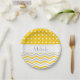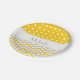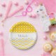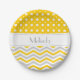 Moderne gelbe, graue, weiße Zickzack und polka dot punktpapierplatte Ein stilvolles, elegantes, mädchenhaftes Design mit klassischen Zickzackstreifen und niedlichen Polka-Punkten mit zeitgemäßem, Vintagem Look in gewisser Weise. In der Mitte ist ein Rahmen. Sie können die Hintergrundfarbe - Maisgelb und Textfarbe aus über 200 Farben aus dem Zazzle Farbdiagramm wählen. Ideal für Kinder zum Geburtstag und Party.