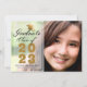 Mit dieser eleganten, individuellen Foto-Ankündigungskarte kündigen Sie Ihren Abschluss stilvoll an. Dieses Design hat Ihr Foto auf der rechten Seite und zu den verlassen ist ein Overlay mit einem Typografie-Design mit den Worten Graduate Class of 20XX mit Ihrem Namen und Schule zu personalisieren in Gold und schwarz Skript durch ein Imitat goldenen Graduate Cap betont. Die Rückseite der Karte ist schwarz. Entworfen von Susan Coffey.