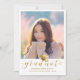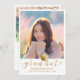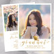 Schicken Sie Ihrer Familie und Ihren Freunden eine einzigartige personalisierte Foto Abschluss Ankündigung, um sie zu wecken. Dieses moderne Template-Design zeigt Ihr Foto gerahmt in weiß und unten in Imitaten Gold-Skript ist das Wort "Graduate" mit Ihrem Namen, Schule und Jahr, um den Akzent durch eine schwarze Graduationskappe personalisieren. Auf der Rückseite der Karte befindet sich ein 2. Foto mit Abschluss-Details von den Eltern. Entworfen von Susan Coffey.