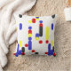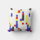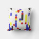 Dieses moderne Kissen weist abstrakte Muster auf, die geometrischen Formen sind gelb, blau, rot und schwarz auf weißem Hintergrund.