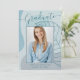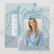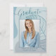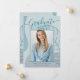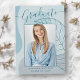 Diese elegante und schicke Ankündigungskarte des Abschlusses besticht durch eine delikate Kalligraphie und ein modernes abstraktes Kunstwerk in den Farbtönen des Aqua Blue. Das Foto der Absolventen hebt die Kartenvorderseite hervor, während auf der Kartenrückseite personalisierte Textstellen für Informationen über den Abschluss und die künftige Reise angeboten werden.
