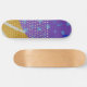 Modernes Skateboard in abstraktem grafischem Design, lila und goldgelb, mit blauen großen, bedrängten Glitzer und weißen kleinen Punkten. Anpassen, um jeden gewollt Text hinzuzufügen.
