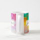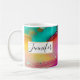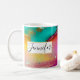 Personalisierte Kaffee-Tasse mit extravagantem künstlerisch abstraktem Design. Wasserfarbenmalerei mit Farbmischungen und -mischungen, die ein fließendes Marmormuster erzeugen. Ein weißer Rahmen mit einem Imitat mit goldener Folienabdeckung überlagert mit einem personalisierten Text, der innen geschrieben ist.