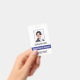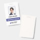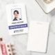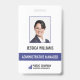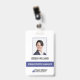 Ein modernes Business-ID-Abzeichen mit Foto, Name, Beruf eines Mitarbeiters. Die moderne Mitarbeiter-ID enthält auch den Firmennamen und das Firmenlogo. Die Farbe eines beliebigen Designelements dieses Abzeichens kann personalisiert sein.