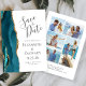 Diese elegante, moderne Save the Date-Karte verfügt über einen aquamarinen blauen Aquarellstreifen mit vergoldetem Imitat-Glitzer. Der anpassbare Text ist kohlegrau auf einem weißen Hintergrund. Ersetzen Sie die fünf Beispielbilder auf der Kartenrückseite einfach durch Ihre Fotos, und fügen Sie einen kurzen Text mit zusätzlichen Informationen (z. B. Ihre Website-URL) hinzu.