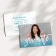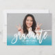 Mit diesem trendigen, weißen Pinsel-Schrift "Graduate" mit aquamarinem blauen Farbverlaufsüberlagsdesign präsentieren Sie Ihr Foto stilvoll. Personalisieren Sie die weiße Formulierung auf der Vorderseite mit dem Namen des Absolventen und das Jahr der Klasse. Die Rückseite der Karte lädt Familie und Freunde zu einer Abschlussfeier ein, um den Anlass zu feiern. Die weiße Hintergrundfarbe auf der Rückseite kann individuell angepasst werden.