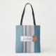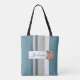 Fügen Sie mit dieser Tasche eine schöne moderne Touch zu Ihrem Shopping-Trip. Die Tote-Tasche hat blaue, bräunliche und weiße Streifen und einen schönen rosa Blumenakzent. Beenden Sie das Aussehen mit Ihrem Familiennamen. Dies wäre ein personalisiertes Geschenk für einen Haushalt, Brautparty, Hochzeit, Geburtstag, Weihnachten oder anderen Urlaub!
