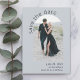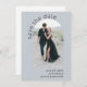 Diese moderne Boho-Hochzeit, die sich durch ihre Einfachheit und ihren künstlerischen Stil auszeichnet, bewahrt den Pop der Dattelkarte mit einem bogenförmigen Fotoplatt auf der Vorderseite der Karte und lädt das gewünschte Foto hoch. Auf der Vorderseite der Karte befindet sich eine Textvorlage, die Sie mit den Namen der Braut und des Bräutigams und dem geplanten Hochzeitstag personalisieren können. Auf der Rückseite dieser Karte befindet sich eine Beispielmeldung mit zusätzlichen Details, die Sie personalisieren können. Die Karte ist hier mit einem hellen, staubblauen Hintergrund dargestellt und ist auch in anderen Farben erhältlich.