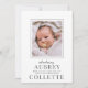 Eine moderne und elegante Baby-Geburts-Ankündigung Fotokarte mit einem weichen pastellblau grünen Hintergrund. Ersetzen Sie einfach das vorhandene Foto auf der Vorderseite durch Ihr eigenes, nahes Foto, und fügen Sie ein Foto auf der Rückseite der Karte hinzu.