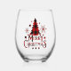 Freuen Sie sich auf den Feiertagsjubiläum mit diesem niedlichen Weinglas, das einen Weihnachtsbaum in rotem und schwarzem Büffel kariert mit den Worten "Frohe Weihnachten", Akzent Sterne und Schneeflocken zeigt.