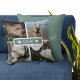 Modernes Beileid mit 4 Fotos in einem Gitter mit mittlerer Textvorlage in staubiger grüner Box "Liebe" mit Herz und persönliche Nachricht auf der Rückseite werfen Kissen.